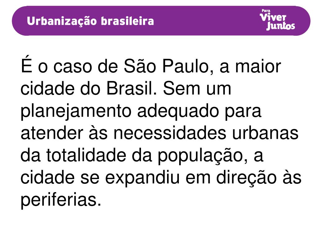 É o caso de São Paulo, a maior cidade do Brasil. Sem um planejamento adequado para atender às necessidades urbanas da totalidade da população, a cidade se expandiu em direção às periferias.
