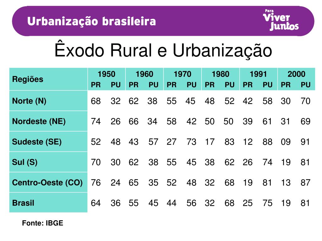Êxodo Rural e Urbanização DISTRIBUIÇÃO DA POPULAÇÃO RURAL (PR) E URBANA (PU) Em Porcentagem Fonte: IBGE
