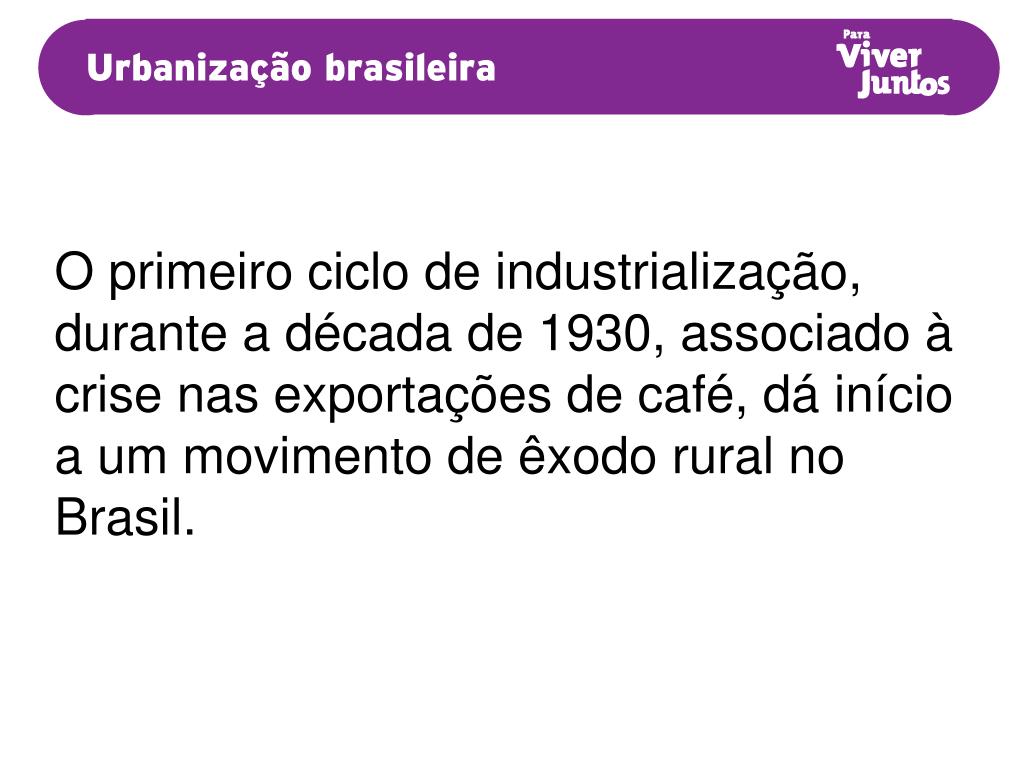 O primeiro ciclo de industrialização, durante a década de 1930, associado à crise nas exportações de café, dá início a um movimento de êxodo rural no Brasil.