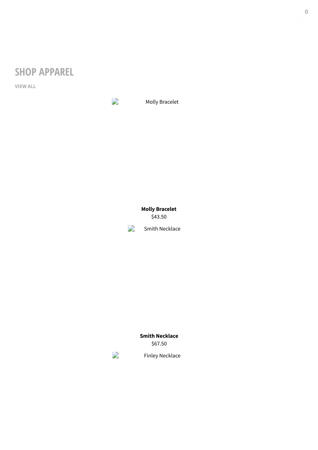 0 SHOP APPAREL VIEW ALL Molly Bracelet Molly Bracelet $43.50 Smith Necklace Smith Necklace $67.50 Finley Necklace