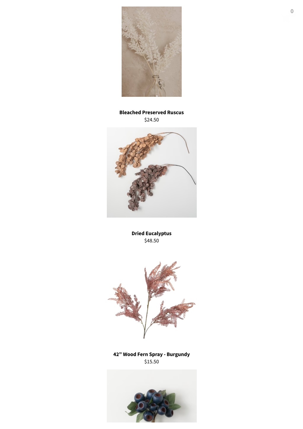 0 Bleached Preserved Ruscus $24.50 Dried Eucalyptus $48.50 42” Wood Fern Spray - Burgundy $15.50