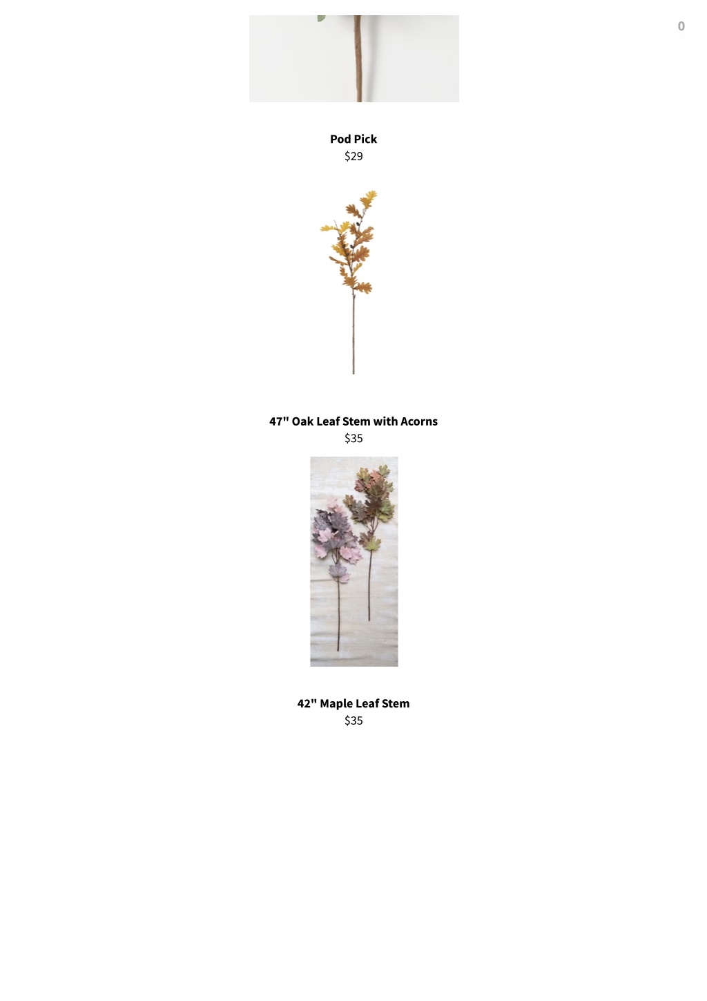 0 Pod Pick $29 47" Oak Leaf Stem with Acorns $35 42" Maple Leaf Stem $35