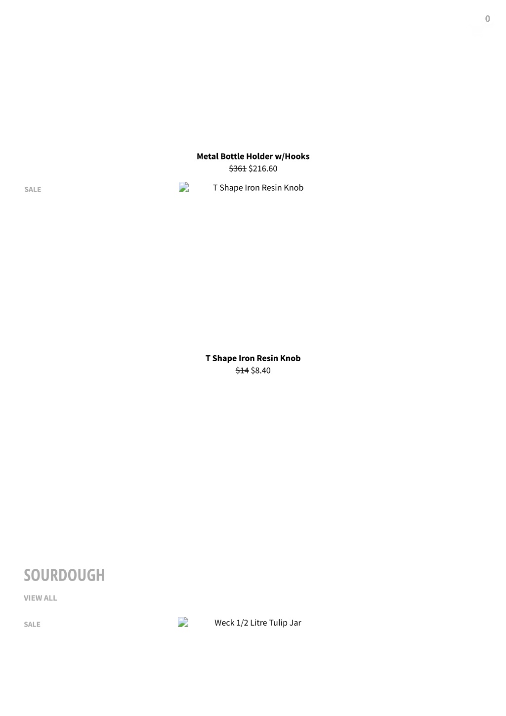 0 Metal Bottle Holder w/Hooks $361 $216.60 T Shape Iron Resin Knob SALE T Shape Iron Resin Knob $14 $8.40 SOURDOUGH VIEW ALL Weck 1/2 Litre Tulip Jar SALE