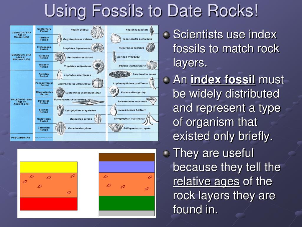 Using Fossils to Date Rocks! • Scientists use index fossils to match rock layers. • An index fossil must be widely distributed and represent a type of organism that existed only briefly. • They are useful because they tell the relative ages of the rock layers they are found in.