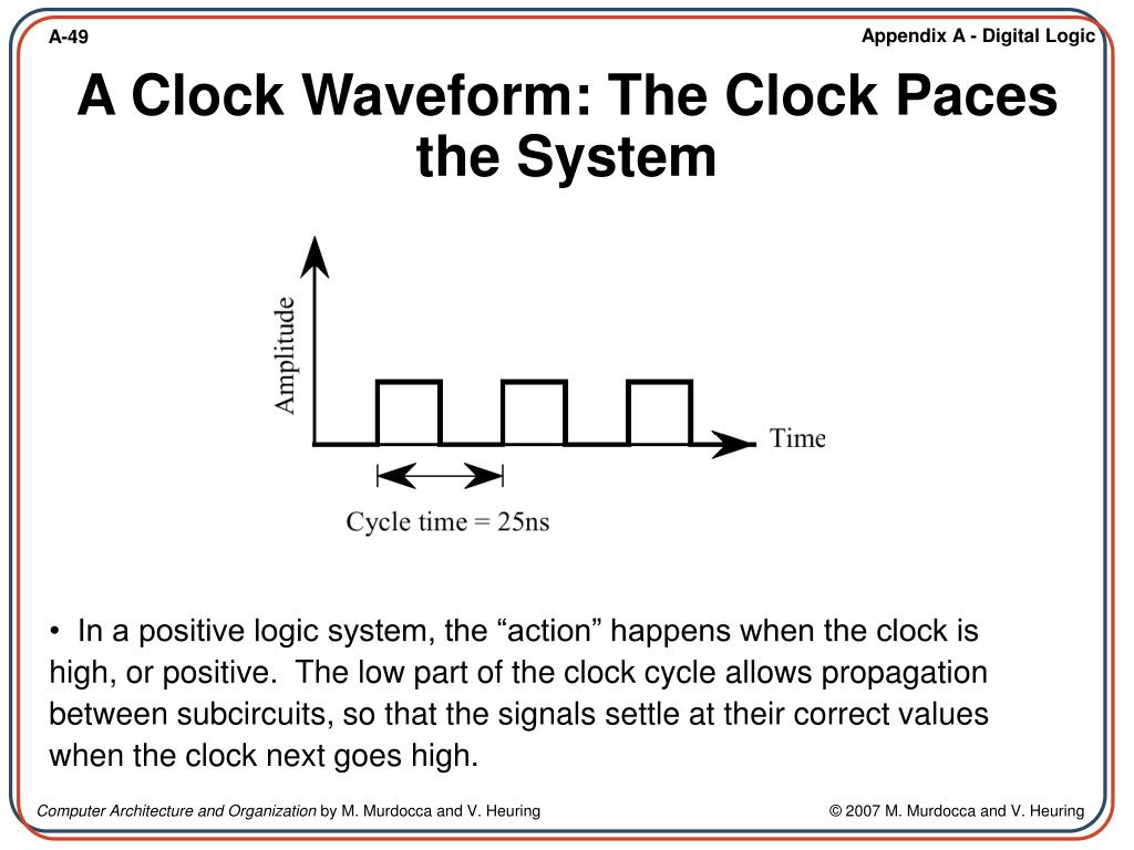 A Clock Waveform: The Clock Paces the System • In a positive logic system, the “action” happens when the clock is high, or positive. The low part of the clock cycle allows propagation between subcircuits, so that the signals settle at their correct values when the clock next goes high.