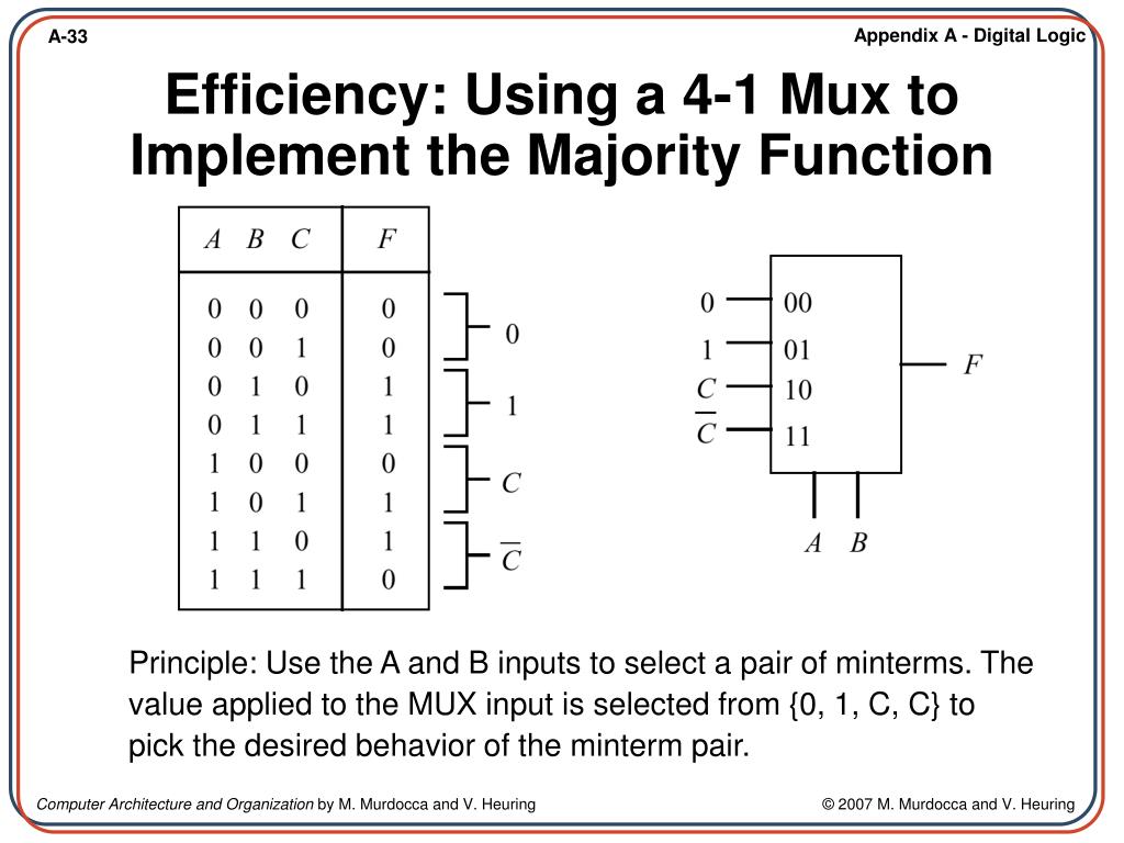 Efficiency: Using a 4-1 Mux to Implement the Majority Function Principle: Use the A and B inputs to select a pair of minterms. The value applied to the MUX input is selected from {0, 1, C, C} to pick the desired behavior of the minterm pair.