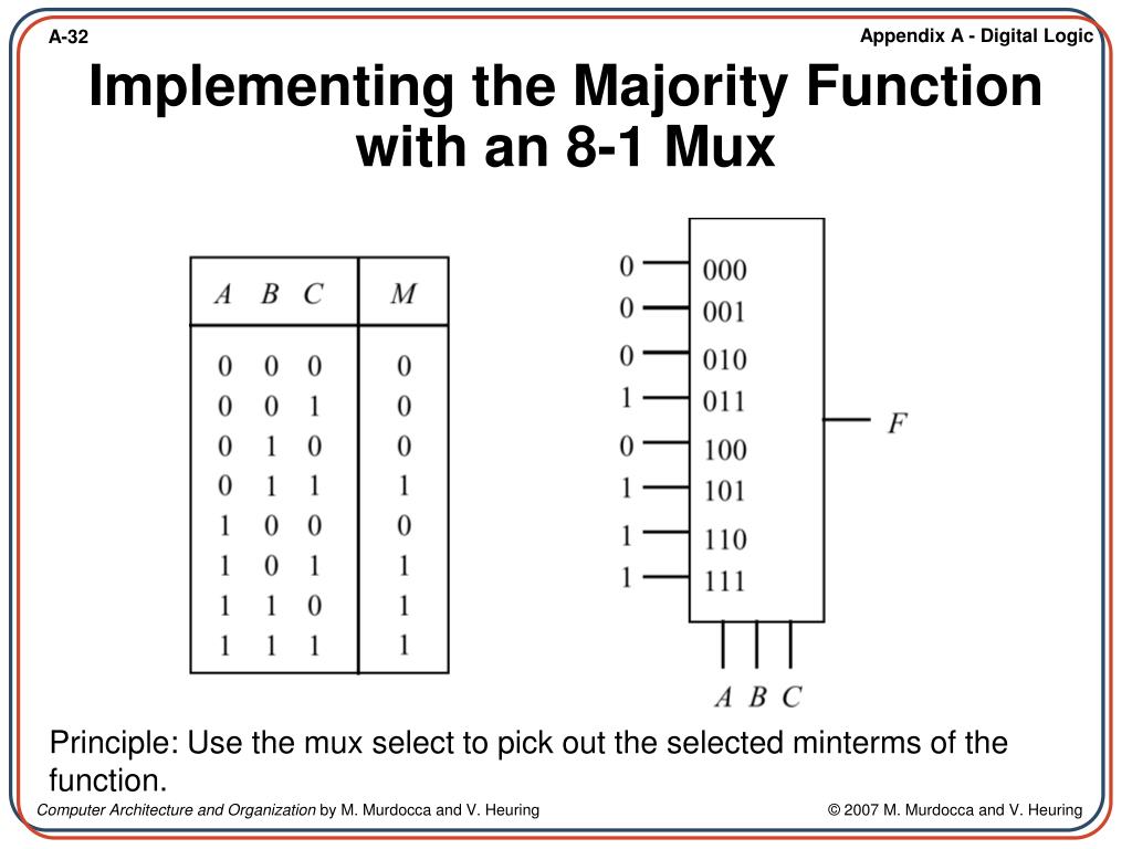 Implementing the Majority Function with an 8-1 Mux Principle: Use the mux select to pick out the selected minterms of the function.
