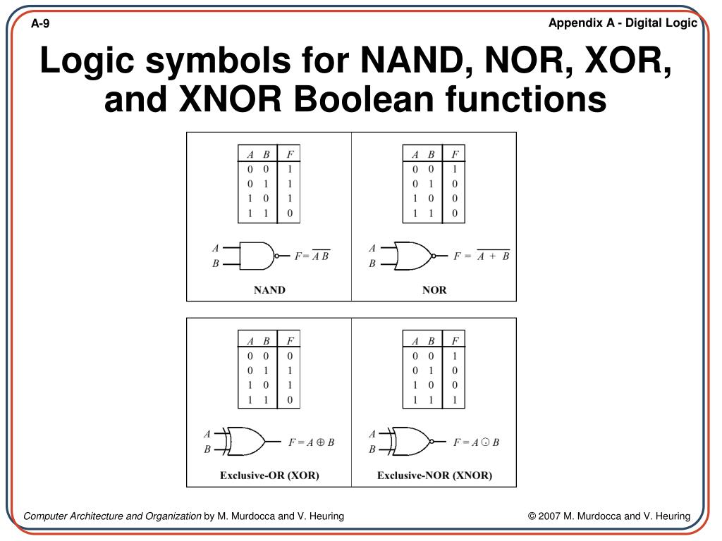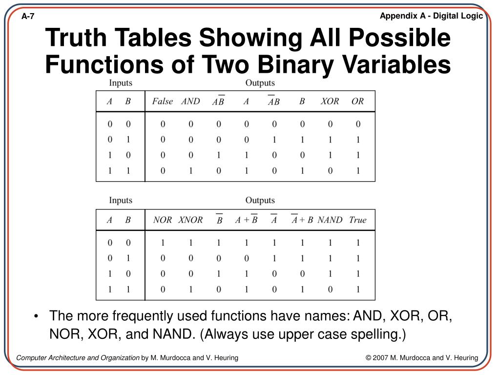 The more frequently used functions have names: AND, XOR, OR, NOR, XOR, and NAND. (Always use upper case spelling.) Truth Tables Showing All Possible Functions of Two Binary Variables