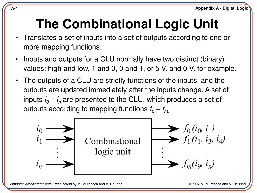 Translates a set of inputs into a set of outputs according to one or more mapping functions. Inputs and outputs for a CLU normally have two distinct (binary) values: high and low, 1 and 0, 0 and 1, or 5 V. and 0 V. for example. The outputs of a CLU are strictly functions of the inputs, and the outputs are updated immediately after the inputs change. A set of inputs i0 – in are presented to the CLU, which produces a set of outputs according to mapping functions f0 – fm. The Combinational Logic Unit