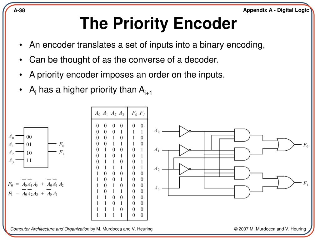 An encoder translates a set of inputs into a binary encoding, Can be thought of as the converse of a decoder. A priority encoder imposes an order on the inputs. Ai has a higher priority than Ai+1 The Priority Encoder