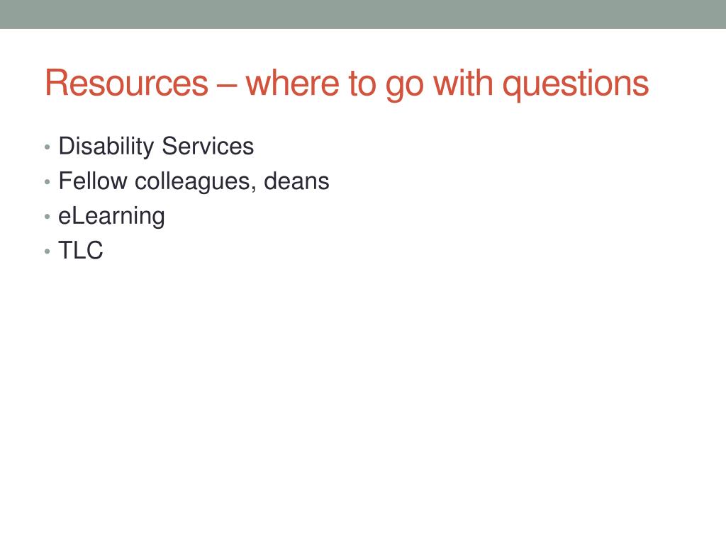 Resources – where to go with questions • Disability Services • Fellow colleagues, deans • eLearning • TLC
