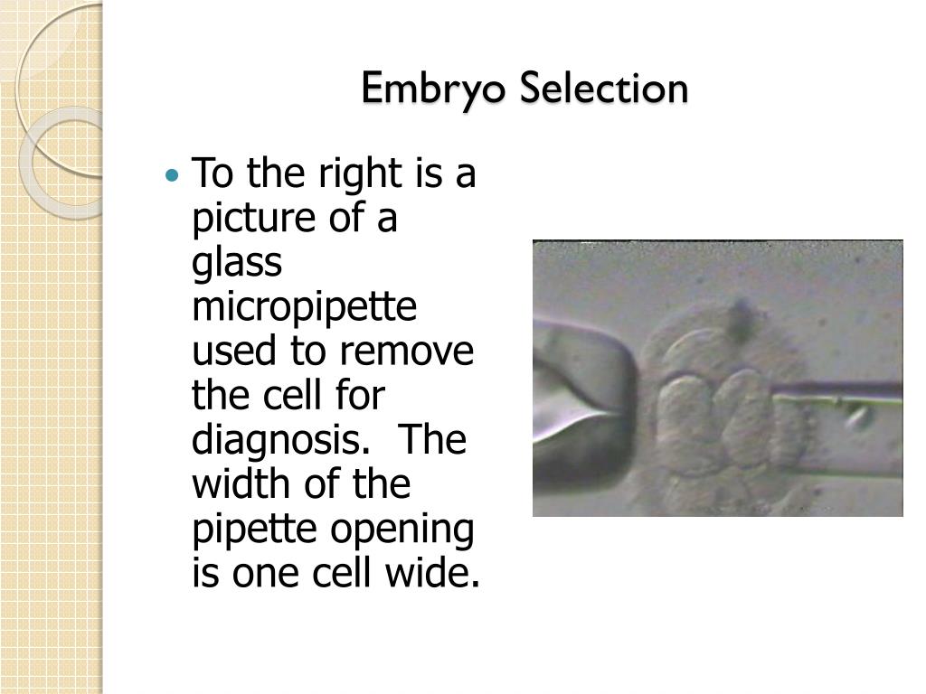 Embryo Selection • To the right is a picture of a glass micropipette used to remove the cell for diagnosis. The width of the pipette opening is one cell wide.