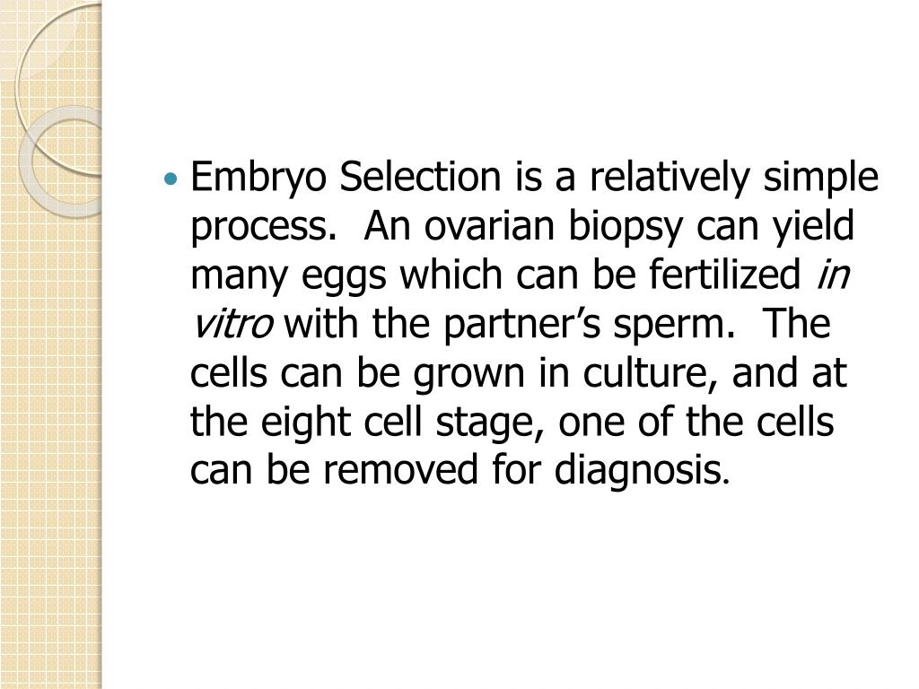 Embryo Selection is a relatively simple process. An ovarian biopsy can yield many eggs which can be fertilized in vitro with the partner’s sperm. The cells can be grown in culture, and at the eight cell stage, one of the cells can be removed for diagnosis.