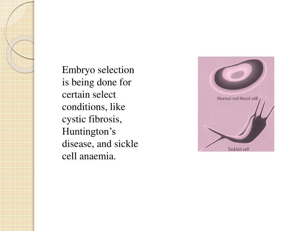 Embryo selection is being done for certain select conditions, like cystic fibrosis, Huntington’s disease, and sickle cell anaemia.