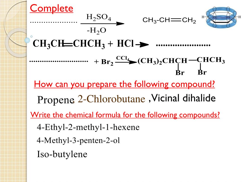 Complete How can you prepare the following compound? , Vicinal dihalide , 2-Chlorobutane Write the chemical formula for the following compounds?