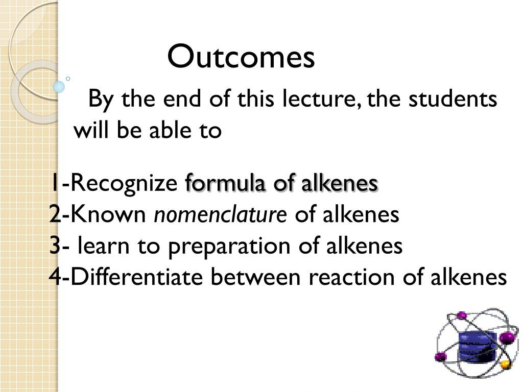 Outcomes By the end of this lecture, the students will be able to 1-Recognize formula of alkenes 2-Knownnomenclature of alkenes 3- learn to preparation of alkenes 4-Differentiate between reaction of alkenes