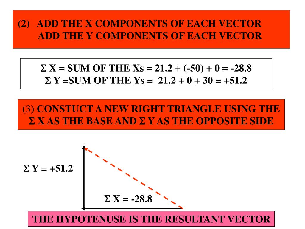 (2) ADD THE X COMPONENTS OF EACH VECTOR ADD THE Y COMPONENTS OF EACH VECTOR X =SUM OF THE Xs = 21.2 + 50 + 0 = +71.2 Y =SUM OF THE Ys = 21.2 + 0 + 30 = +51.2 (3) CONSTUCT A NEW RIGHT TRIANGLE USING THE X AS THE BASE AND Y AS THE OPPOSITE SIDE Y = +51.2 X = +71.2 THE HYPOTENUSE IS THE RESULTANT VECTOR