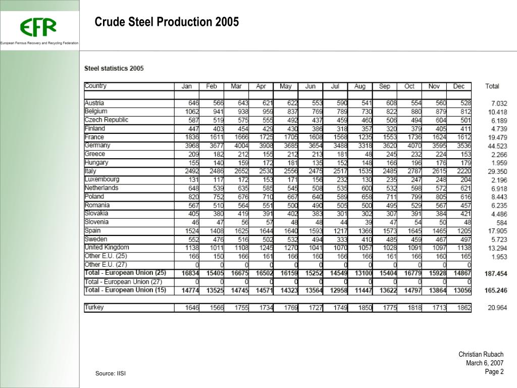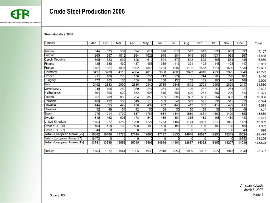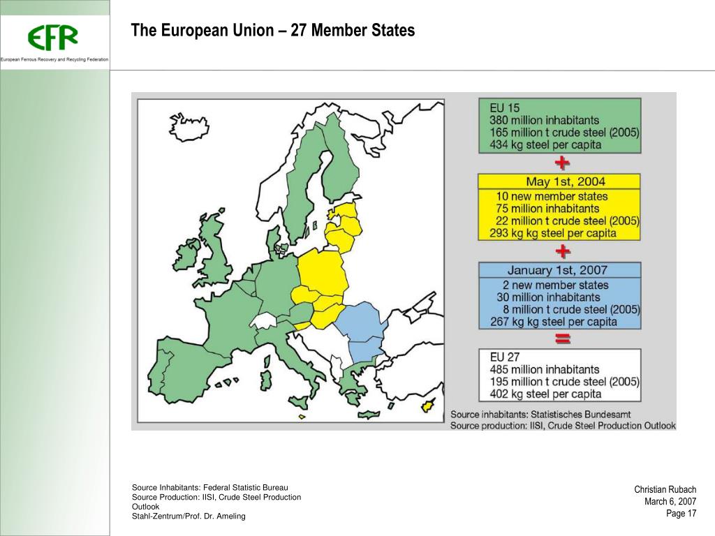The European Union – 27 Member States Source Inhabitants: Federal Statistic BureauSource Production: IISI, Crude Steel Production OutlookStahl-Zentrum/Prof. Dr. Ameling
