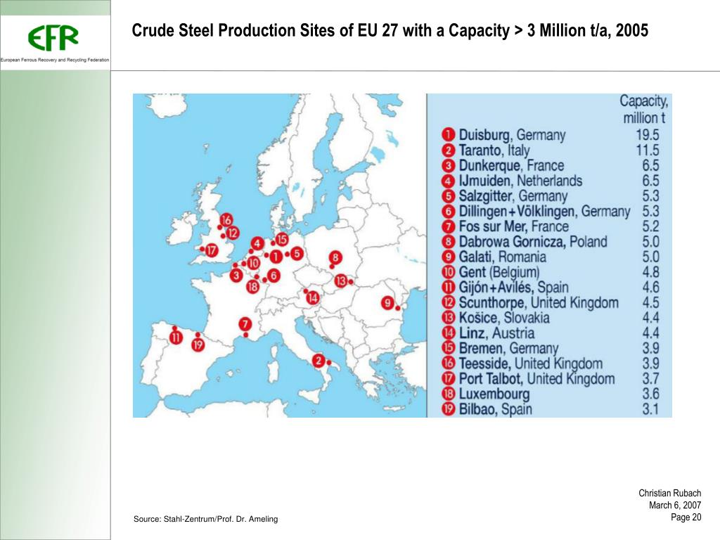 Crude Steel Production Sites of EU 27 with a Capacity > 3 Million t/a, 2005 Source: Stahl-Zentrum/Prof. Dr. Ameling