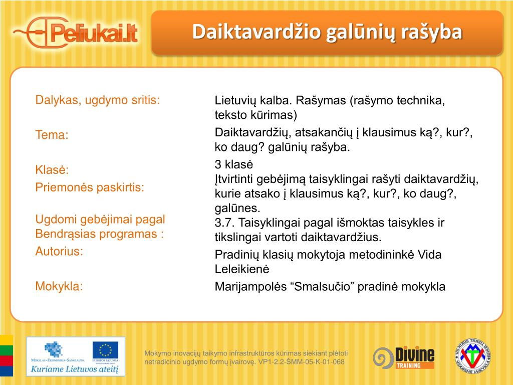Daiktavardžio galūnių rašyba Dalykas, ugdymo sritis: Tema: Klasė: Priemonės paskirtis: Ugdomi gebėjimai pagal Bendrąsias programas : Autorius: Mokykla: Lietuvių kalba. Rašymas (rašymo technika, teksto kūrimas) Daiktavardžių, atsakančių į klausimus ką?, kur?, ko daug? galūnių rašyba. 3 klasė Įtvirtinti gebėjimą taisyklingai rašyti daiktavardžių, kurie atsako į klausimus ką?, kur?, ko daug?, galūnes. 3.7. Taisyklingai pagal išmoktas taisykles ir tikslingai vartoti daiktavardžius. Pradinių klasių mokytoja metodininkė Vida Leleikienė Marijampolės “Smalsučio” pradinė mokykla