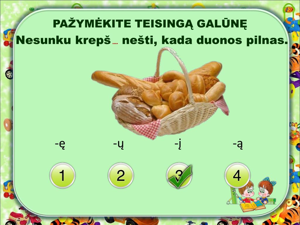 PAŽYMĖKITE TEISINGĄ GALŪNĘ Nesunku krepš.... nešti, kada duonos pilnas. -ę -ų -į -ą