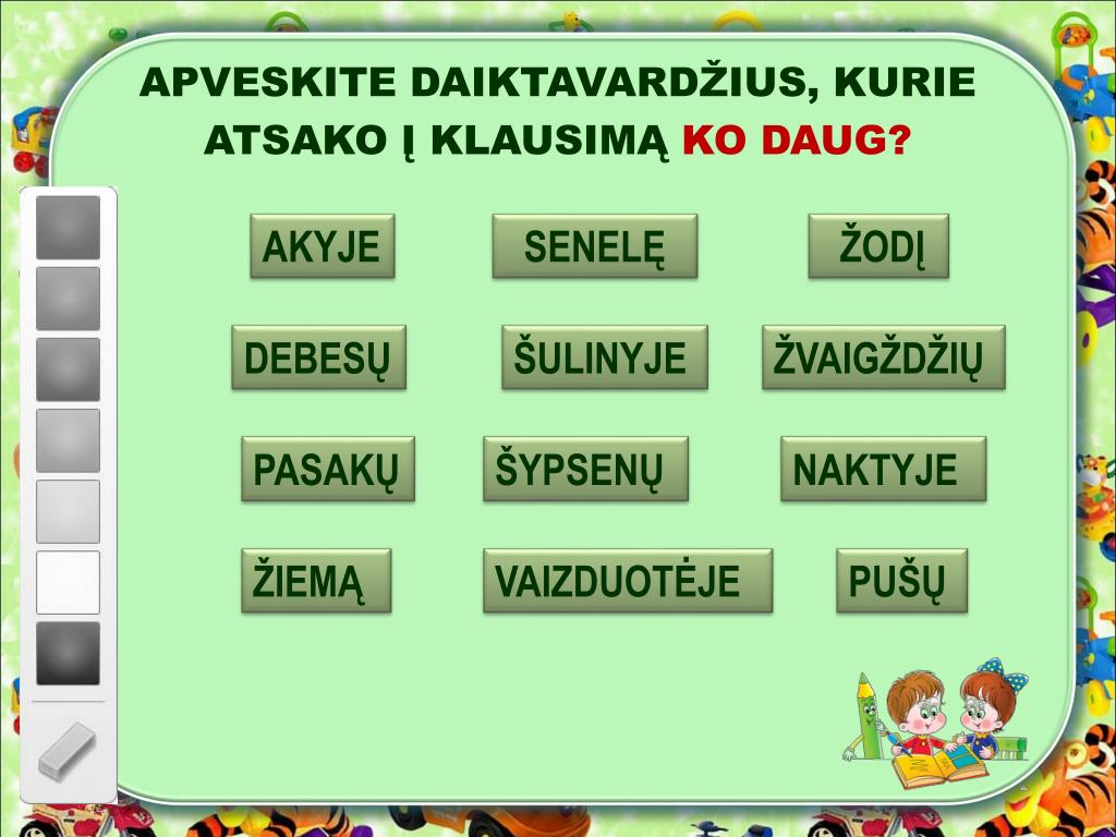 APVESKITE DAIKTAVARDŽIUS, KURIE ATSAKO Į KLAUSIMĄ KO DAUG? AKYJE SENELĘ ŽODĮ DEBESŲ ŠULINYJE ŽVAIGŽDŽIŲ PASAKŲ ŠYPSENŲ NAKTYJE ŽIEMĄ VAIZDUOTĖJE PUŠŲ