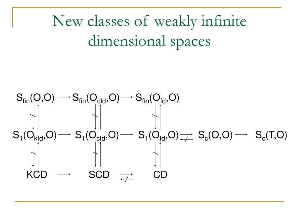 New classes of weakly infinite dimensional spaces Sfin(O,O) Sfin(Ocfd,O) Sfin(Ofd,O) S1(Okfd,O) S1(Ocfd,O) S1(Ofd,O) Sc(O,O) Sc(T,O) KCD SCD CD