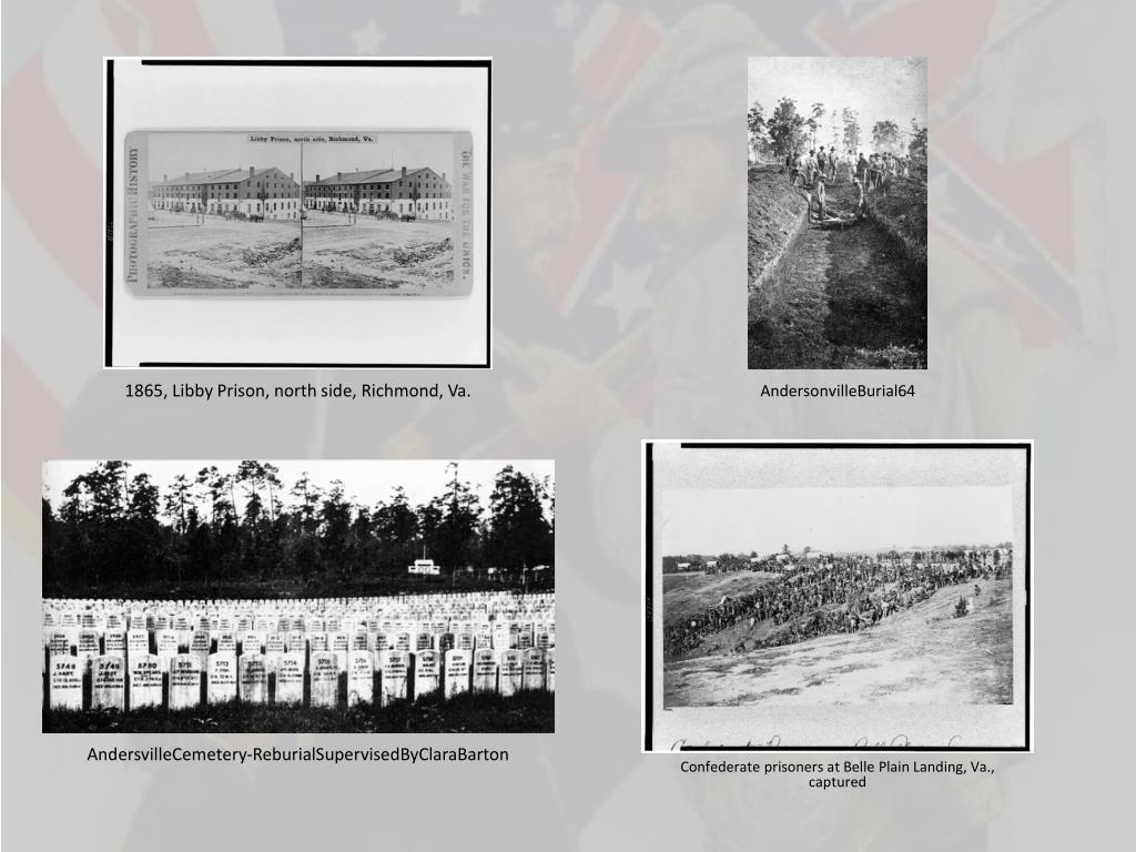 1865, Libby Prison, north side, Richmond, Va. AndersonvilleBurial64 AndersvilleCemetery-ReburialSupervisedByClaraBarton Confederate prisoners at Belle Plain Landing, Va., captured
