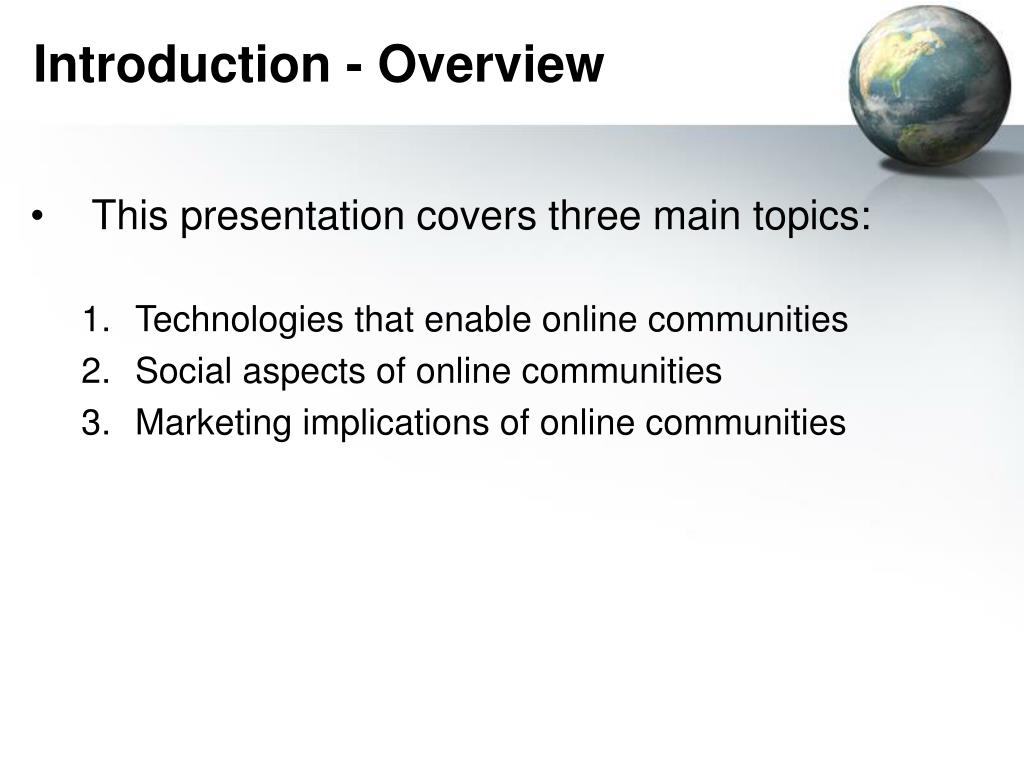 Introduction - Overview • This presentation covers three main topics: • Technologies that enable online communities • Social aspects of online communities • Marketing implications of online communities