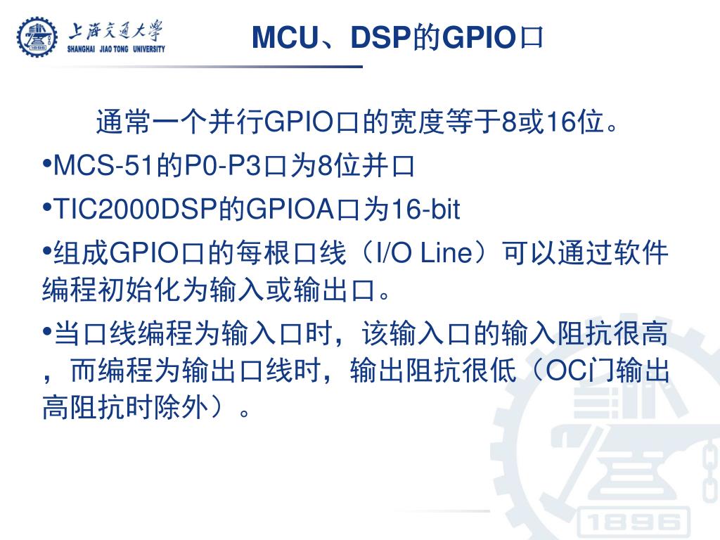 MCU、DSP的GPIO口 通常一个并行GPIO口的宽度等于8或16位。 • MCS-51的P0-P3口为8位并口 • TIC2000DSP的GPIOA口为16-bit • 组成GPIO口的每根口线(I/O Line)可以通过软件编程初始化为输入或输出口。 • 当口线编程为输入口时,该输入口的输入阻抗很高,而编程为输出口线时,输出阻抗很低(OC门输出高阻抗时除外)。