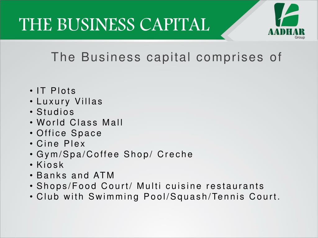 THE BUSINESS CAPITAL “ A concept which is unique and made countries to interact for business transaction in all spheres of the world ”. Bill Gates Keeping this Idea in our mind ,Aadhar Group conceived this project and presenting the next Business Capital of the world at Knowledge Park- V,Greater Noida with the world class infrastructure and high end architectural designs encompassing all required services in one complex.
