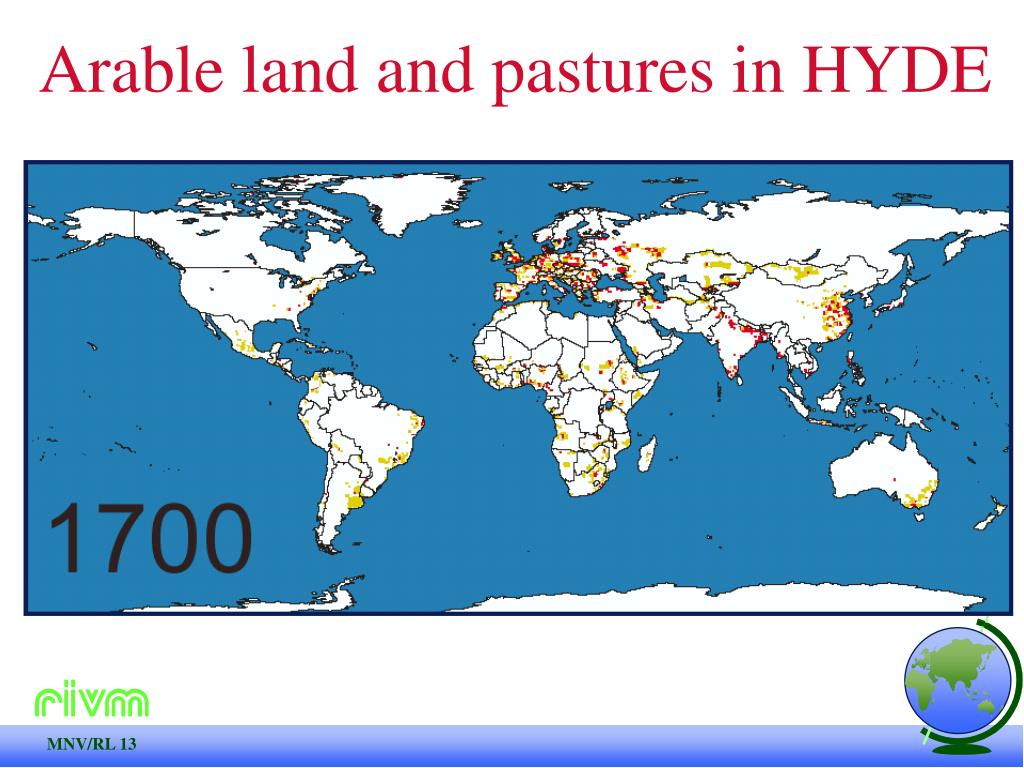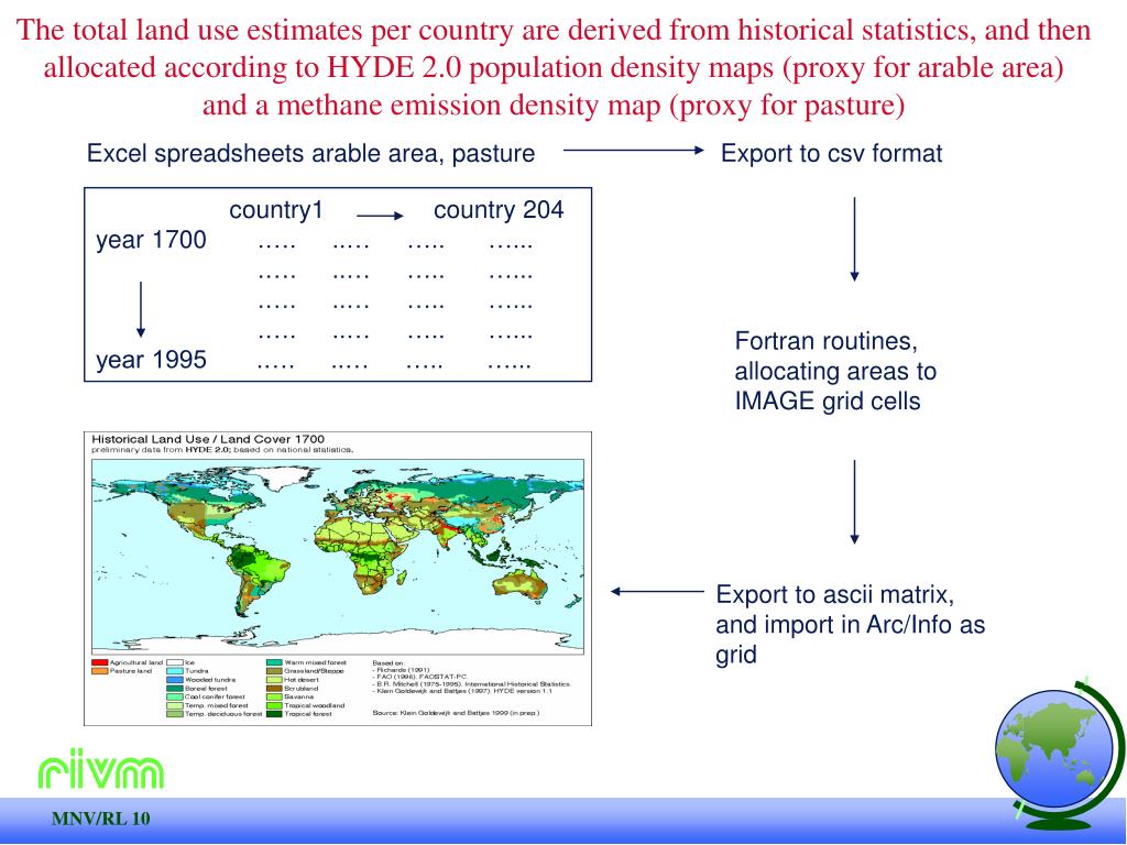 The total land use estimates per country are derived from historical statistics, and then allocated according to HYDE 2.0 population density maps (proxy for arable area) and a methane emission density map (proxy for pasture) Excel spreadsheets arable area, pasture Export to csv format country1 country 204 year 1700 .…. ..… ….. …... .…. ..… ….. …... .…. ..… ….. …... .…. ..… ….. …... year 1995 .…. ..… ….. …... Fortran routines, allocating areas to IMAGE grid cells Export to ascii matrix, and import in Arc/Info as grid