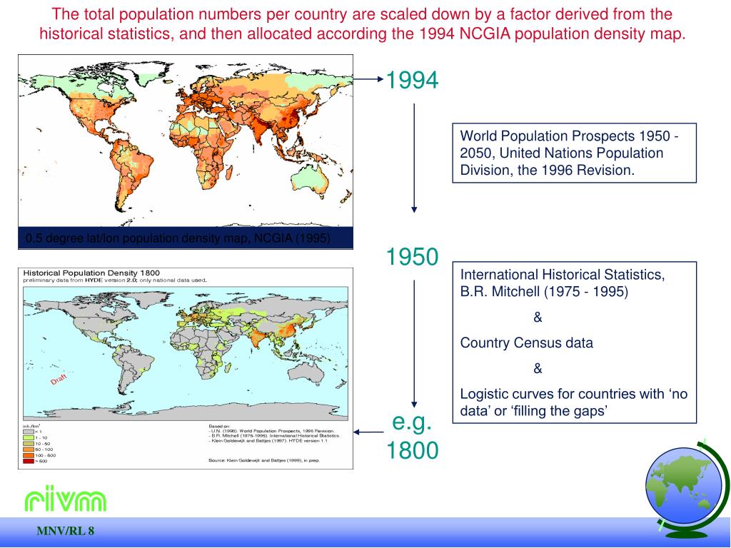 The total population numbers per country are scaled down by a factor derived from the historical statistics, and then allocated according the 1994 NCGIA population density map. 1994 World Population Prospects 1950 - 2050, United Nations Population Division, the 1996 Revision. 0.5 degree lat/lon population density map, NCGIA (1995) 1950 International Historical Statistics, B.R. Mitchell (1975 - 1995) & Country Census data & Logistic curves for countries with ‘no data’ or ‘filling the gaps’ e.g. 1800