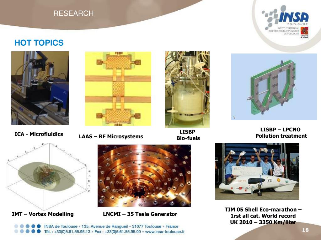 RESEARCH HOT TOPICS LISBP – LPCNO Pollution treatment LISBP Bio-fuels ICA - Microfluidics LAAS – RF Microsystems TIM 05 Shell Eco-marathon – 1rst all cat. World record UK 2010 – 3350 Km/liter IMT – Vortex Modelling LNCMI – 35 Tesla Generator