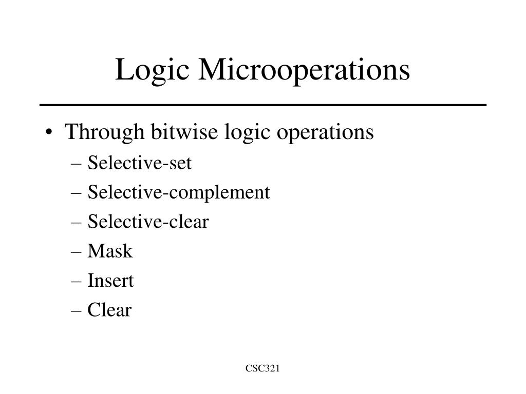 Logic Microoperations • Counter-part to the arithmetic microoperations we looked at last week • Similar to Boolean functions (expressions) except that the operands are registers (bit strings) rather than individual Boolean variables • This is exactly what you implemented in code CSC321