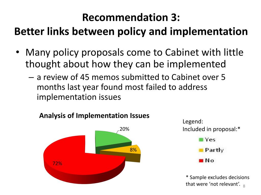 Recommendation 3:Better links between policy and implementation • Many policy proposals come to Cabinet with little thought about how they can be implemented • a review of 45 memos submitted to Cabinet over 5 months last year found most failed to address implementation issues Legend: Included in proposal:* * Sample excludes decisions that were ‘not relevant’.