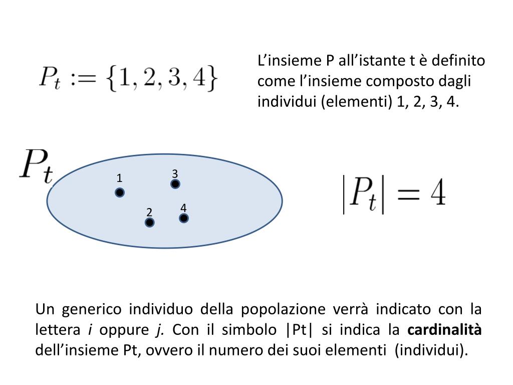 L’insieme P all’istante t è definito come l’insieme composto dagli individui (elementi) 1, 2, 3, 4. 3 1 4 2 Un generico individuo della popolazione verrà indicato con la lettera i oppure j. Con il simbolo |Pt| si indica la cardinalità dell’insieme Pt, ovvero il numero dei suoi elementi (individui).