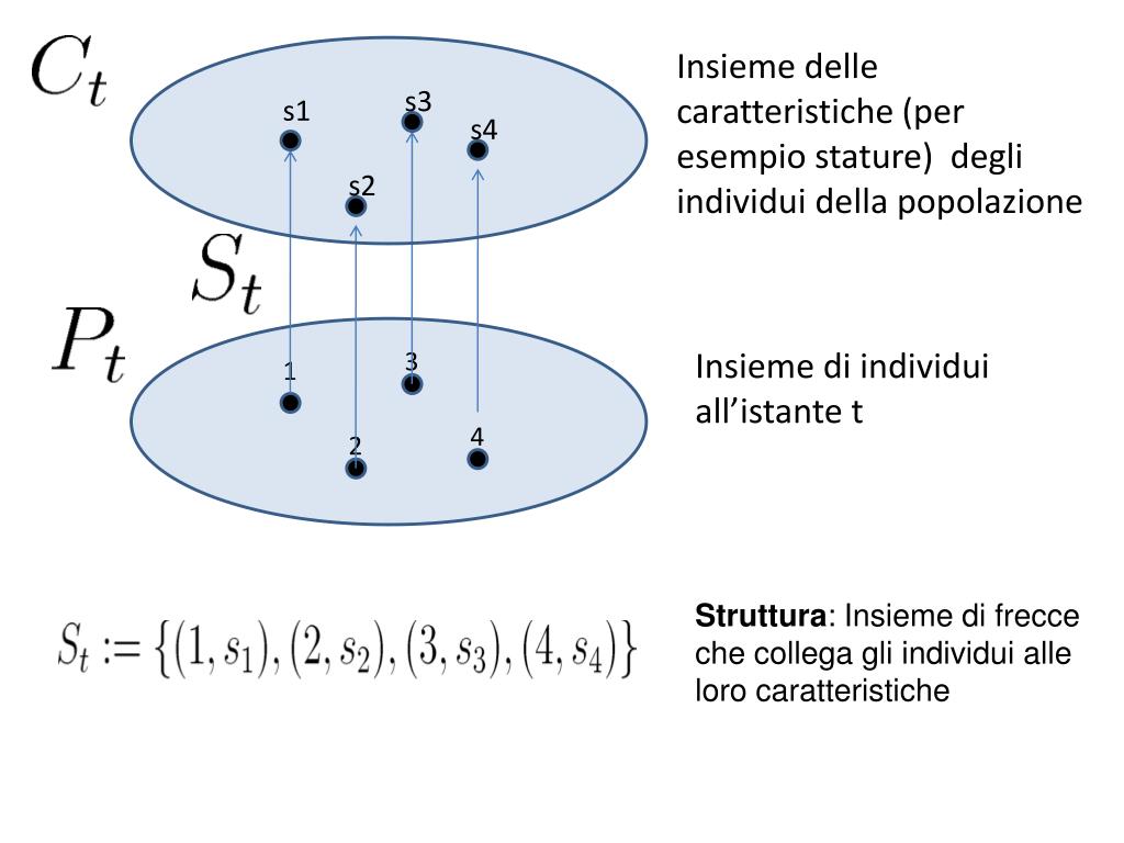 Insieme delle caratteristiche (per esempio stature) degli individui della popolazione s3 s1 s4 s2 Insieme di individui all’istante t 3 1 4 2 Struttura: Insieme di frecce che collega gli individui alle loro caratteristiche