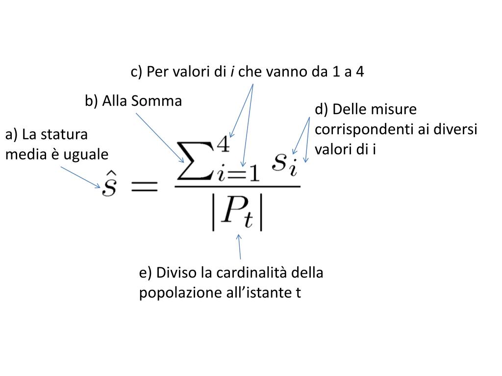 c) Per valori di i che vanno da 1 a 4 b) Alla Somma d) Delle misure corrispondenti ai diversi valori di i a) La statura media è uguale e) Diviso la cardinalità della popolazione all’istante t