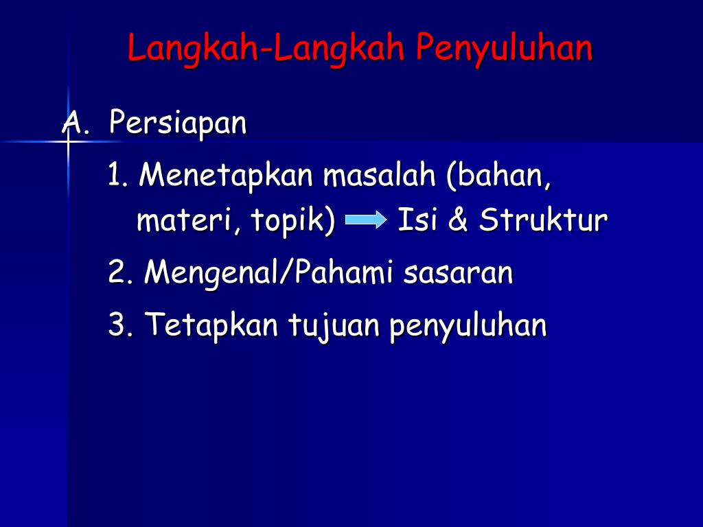 Langkah-Langkah Penyuluhan A. Persiapan 1. Menetapkan masalah (bahan, materi, topik) Isi & Struktur 2. Mengenal/Pahami sasaran 3. Tetapkan tujuan penyuluhan