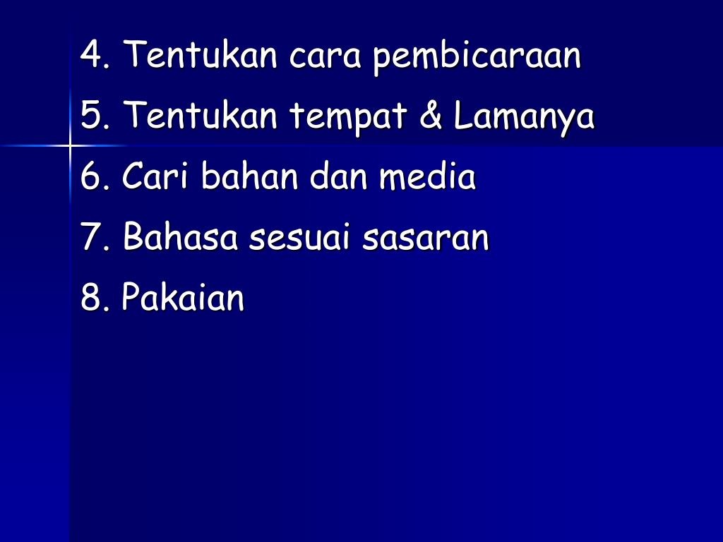 4. Tentukan cara pembicaraan 5. Tentukan tempat & Lamanya 6. Cari bahan dan media 7. Bahasa sesuai sasaran 8. Pakaian