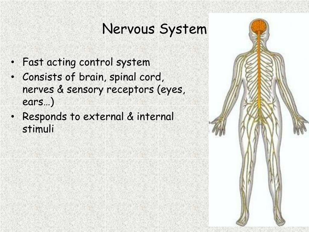 Nervous System • Fast acting control system • Consists of brain, spinal cord, nerves & sensory receptors (eyes, ears…) • Responds to external & internal stimuli