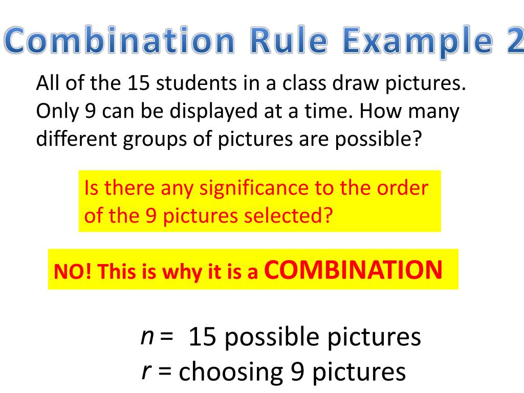 Combination Rule Example 2 All of the 15 students in a class draw pictures. Only 9 can be displayed at a time. How many different groups of pictures are possible? Is there any significance to the order of the 9 pictures selected? NO! This is why it is a COMBINATION n= 15 possible pictures r = choosing 9 pictures