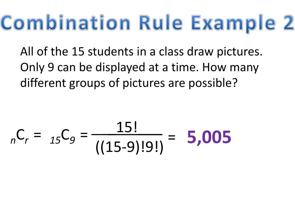 Combination Rule Example 2 All of the 15 students in a class draw pictures. Only 9 can be displayed at a time. How many different groups of pictures are possible? ___15!___ ((15-9)!9!) nCr = 15C9 = 5,005 =