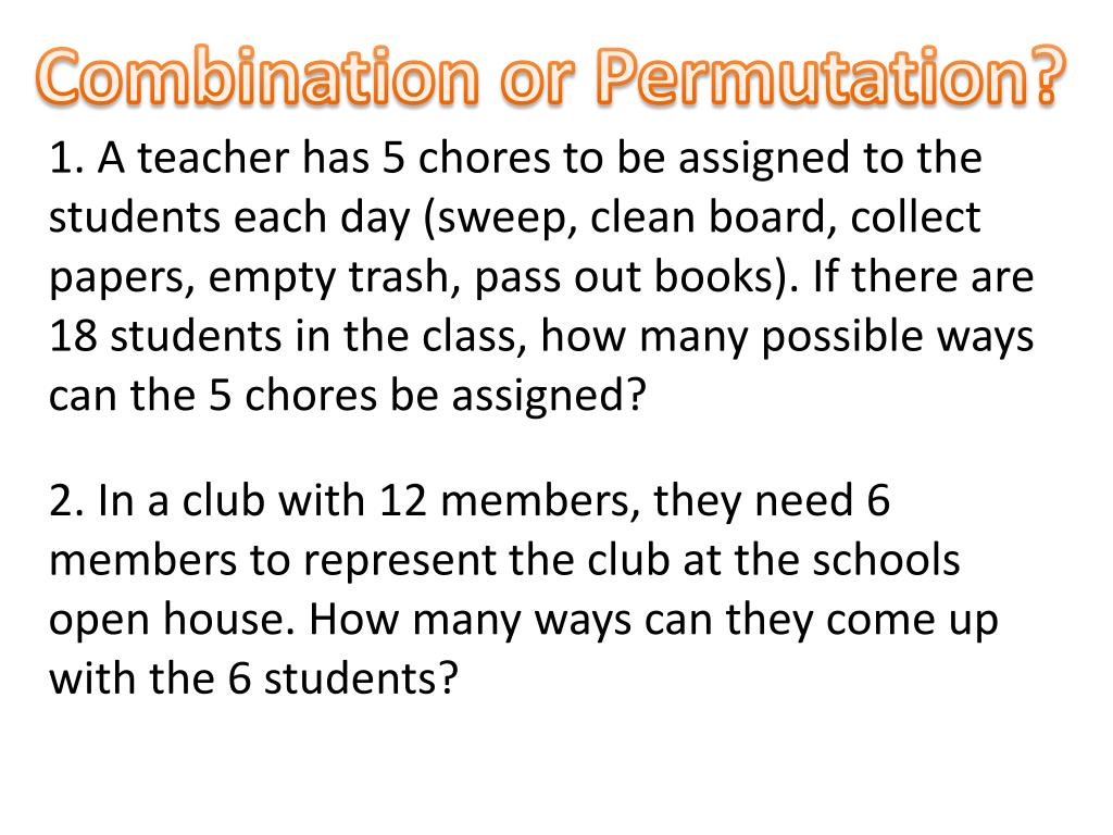 Combination or Permutation? 1. A teacher has 5 chores to be assigned to the students each day (sweep, clean board, collect papers, empty trash, pass out books). If there are 18 students in the class, how many possible ways can the 5 chores be assigned? 2. In a club with 12 members, they need 6 members to represent the club at the schools open house. How many ways can they come up with the 6 students?