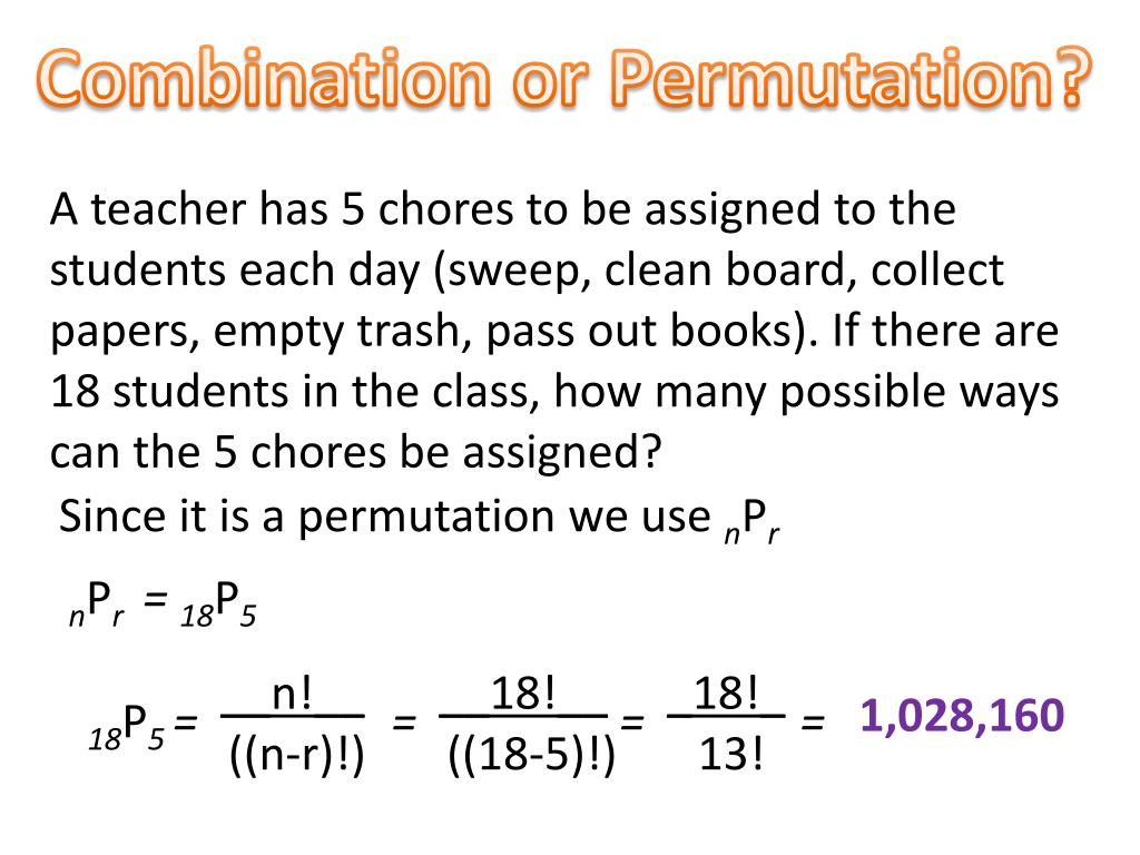 Combination or Permutation? A teacher has 5 chores to be assigned to the students each day (sweep, clean board, collect papers, empty trash, pass out books). If there are 18 students in the class, how many possible ways can the 5 chores be assigned? Ask yourself, does order matter or are you just choosing 5 students regardless of order? Order matters, therefore it is a PERMUTATION