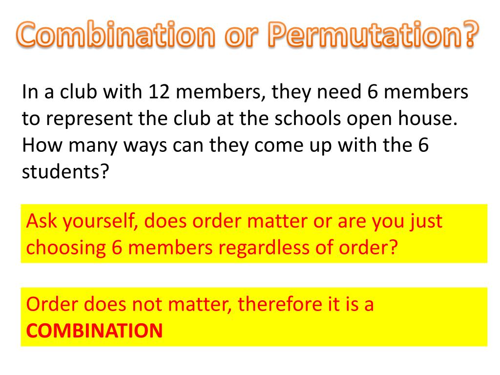 Combination or Permutation? In a club with 12 members, they need 6 members to represent the club at the schools open house. How many ways can they come up with the 6 students? Ask yourself, does order matter or are you just choosing 6 members regardless of order? Order does not matter, therefore it is a COMBINATION