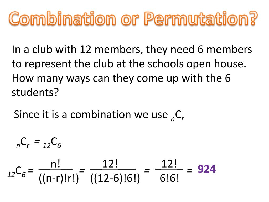 Combination or Permutation? In a club with 12 members, they need 6 members to represent the club at the schools open house. How many ways can they come up with the 6 students? Since it is a combination we use nCr nCr = 12C6 __n!__((n-r)!r!) __12!___ ((12-6)!6!) _12!_ 6!6! 924 12C6 = = = =