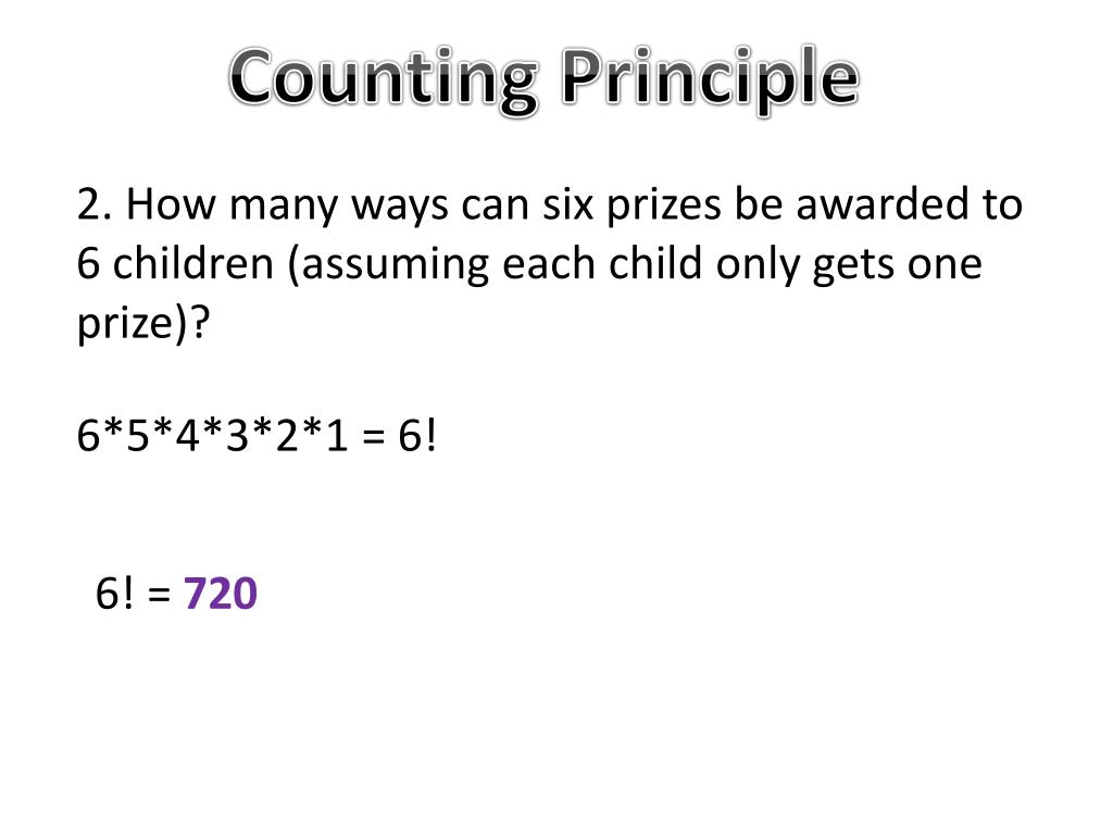 Counting Principle 2. How many ways can six prizes be awarded to 6 children (assuming each child only gets one prize)? 6*5*4*3*2*1 = 6! 6! = 720