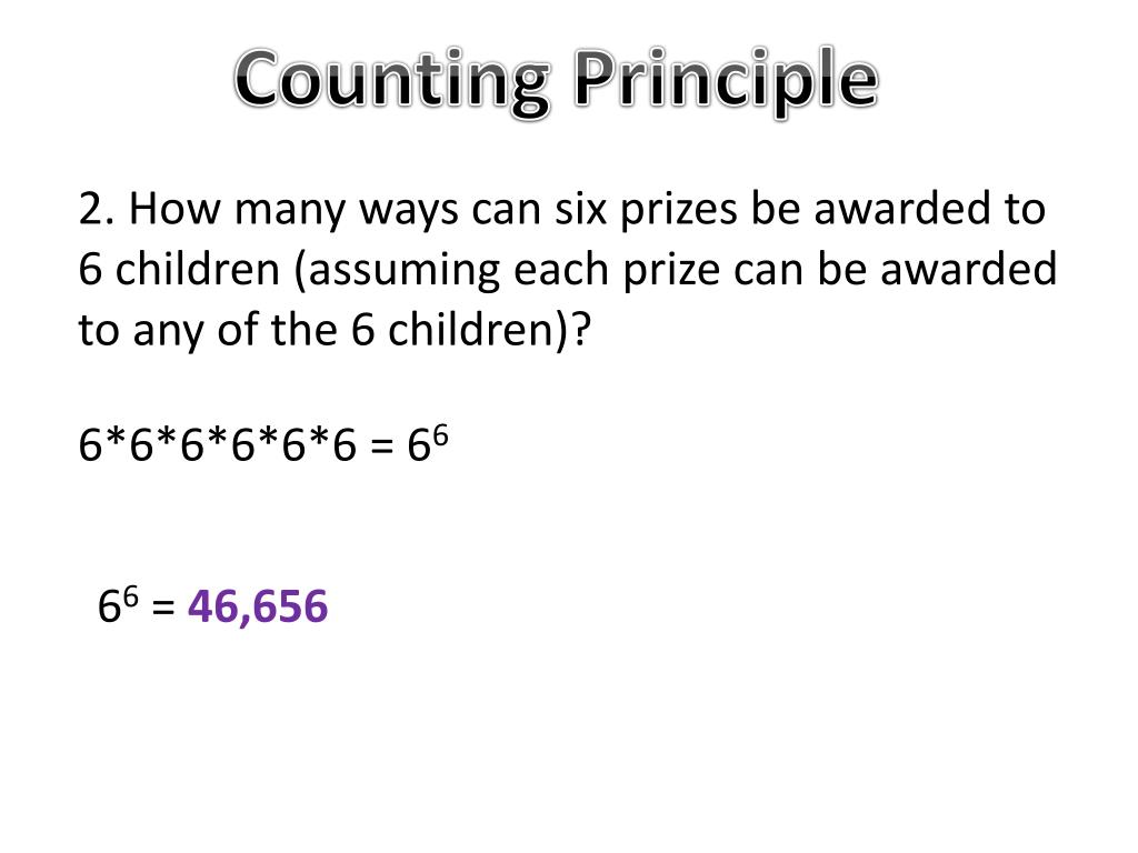 Counting Principle 2. How many ways can six prizes be awarded to 6 children (assuming each prize can be awarded to any of the 6 children)? 6*6*6*6*6*6 = 66 66 = 46,656